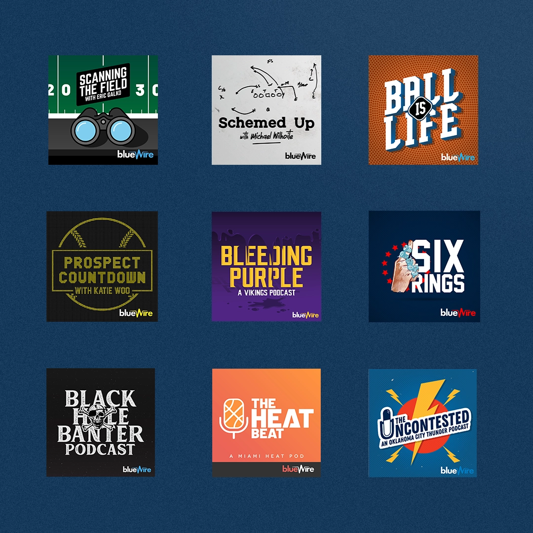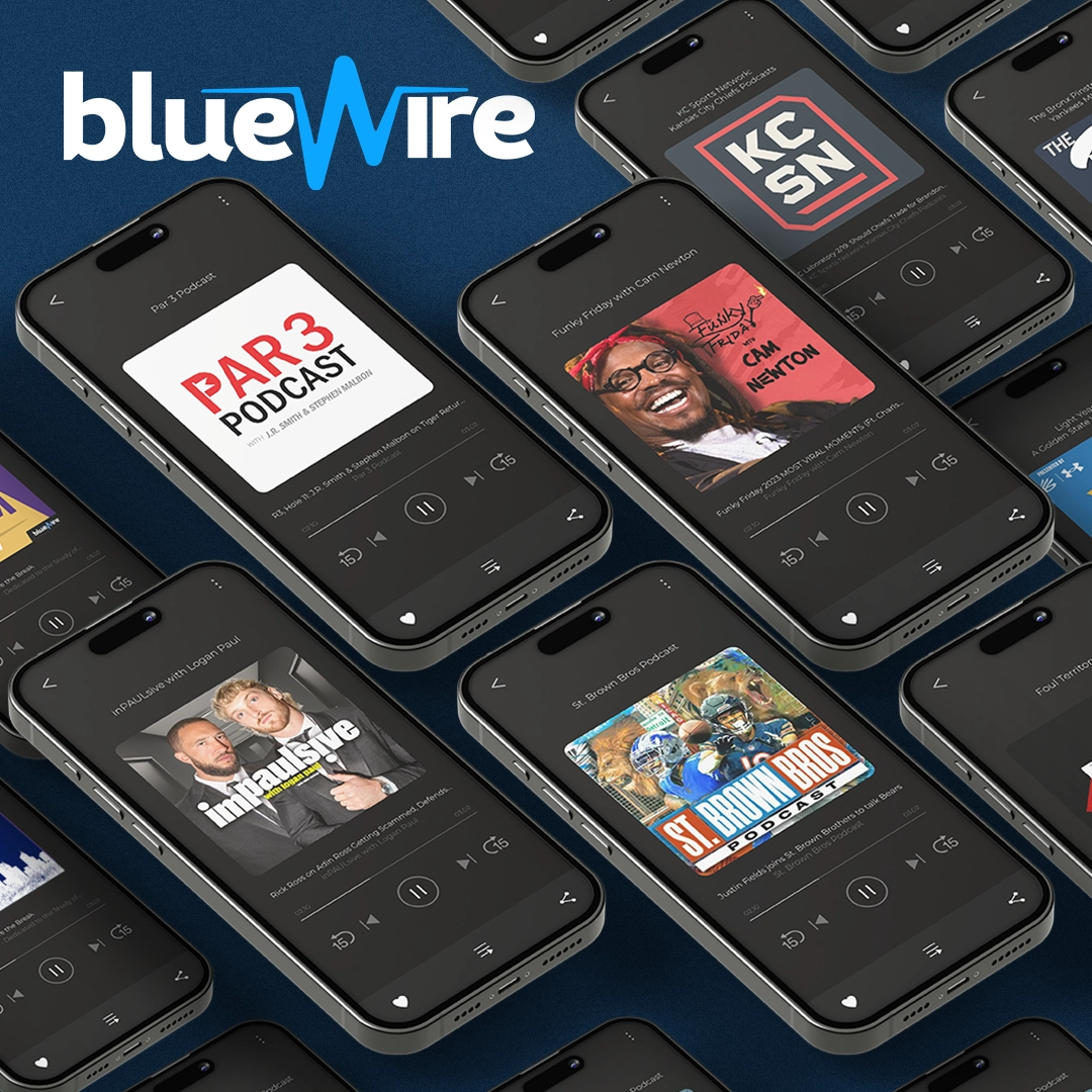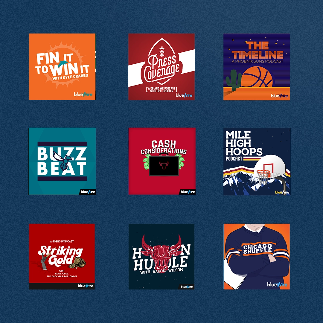 As Blue Wire grew, so did the scope of what I was asked to do. I've personally branded more than 100 podcasts in the network, developing visual identities for shows hosted by names like Cam Newton, Dwight Howard, Michael Irvin, Richard Jefferson, D'Angelo Russell, Darius Slay, Amon-Ra St. Brown, and Chris Long. The work evolved from quick cover art into full production asset packages — the kind of visuals that need to hold up next to professional talent and major media. Through each phase, I was also quietly doing something else: shaping and maintaining the Blue Wire brand itself. As the network expanded and the roster of shows diversified, keeping a coherent visual identity across hundreds of touchpoints became its own discipline. I managed that consistency for years, making sure the brand could flex to fit new shows and talent without losing what made it recognizable.